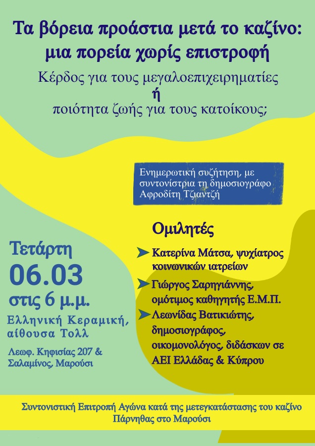 Η Συντονιστική Επιτροπή Αγώνα κατά της μετεγκατάστασης του καζίνο Πάρνηθας στο Μαρούσι, σας προσκαλεί στην Ενημερωτική Συζήτηση για τις επιπτώσεις της μετεγκατάστασης του καζίνο Πάρνηθας στο Μαρούσι, στην Ελληνική Κεραμική (Αίθουσα Τολλ, Λεωφόρος Κηφισίας 207,Μαρούσι, είσοδος και από οδό Σαλαμίνος) την Τετάρτη 6 Μαρτίου 2024 και ώρα 6 μ.μ.
