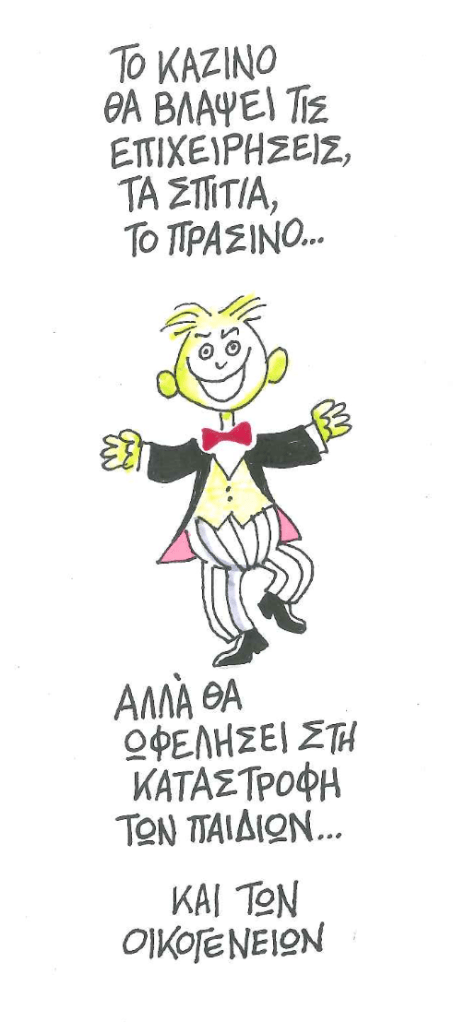 Ο τζόγος είναι μια παρασιτική οικονομική δραστηριότητα που βλάπτει την κοινωνία και την οικογένεια. Η κατασκευή ενός τεράστιου “ναού” του τζόγου μέσα στον αστικό ιστό δημιουργεί μια ποιοτική αλλαγή νομιμοποίησης του τζόγου που συνοδεύεται από άλλες “σκοτεινές” δραστηριότητες (ενεχυροδανειστήρια, τοκογλυφία, πορνεία, κ.α.).